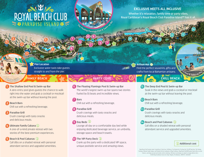 Abril de 2024 - Inaugurado en 2025, Royal Beach Club Paradise Island de Royal Caribbean será un pedazo de paraíso de casi siete hectáreas en Nassau, las Bahamas. La cultura y la gente de las Bahamas serán el corazón de esta incomparable experiencia de playa, que contará con tres impresionantes piscinas, dos playas, bares en la piscina, cabañas privadas, lugares para comer y beber, y mucho más.