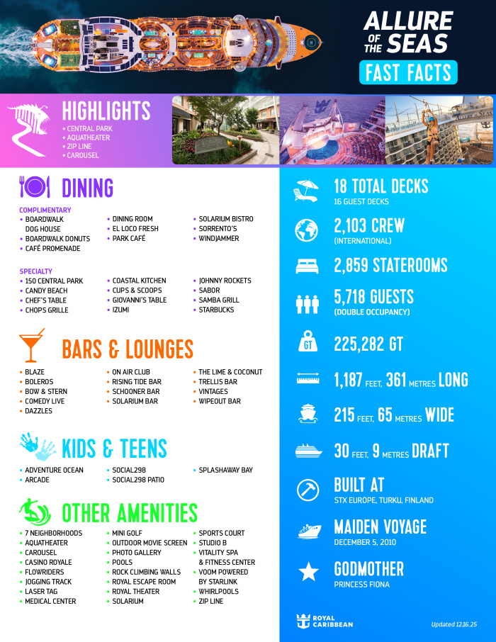 August 2024 - Royal Caribbean reveals a first look at the more than $100 million amplification coming to the game-changing Allure of the Seas. The all-out glow-up debuts in April 2025, ahead of Allure’s summer in Europe from Barcelona, Spain. Every type of family and vacationer has in store 35-plus ways to dine and drink, including the recently debuted Pesky Parrot tiki bar, plus new thrills and ways to chill across the 10-story Ultimate Abyss, resort-style pools and more.