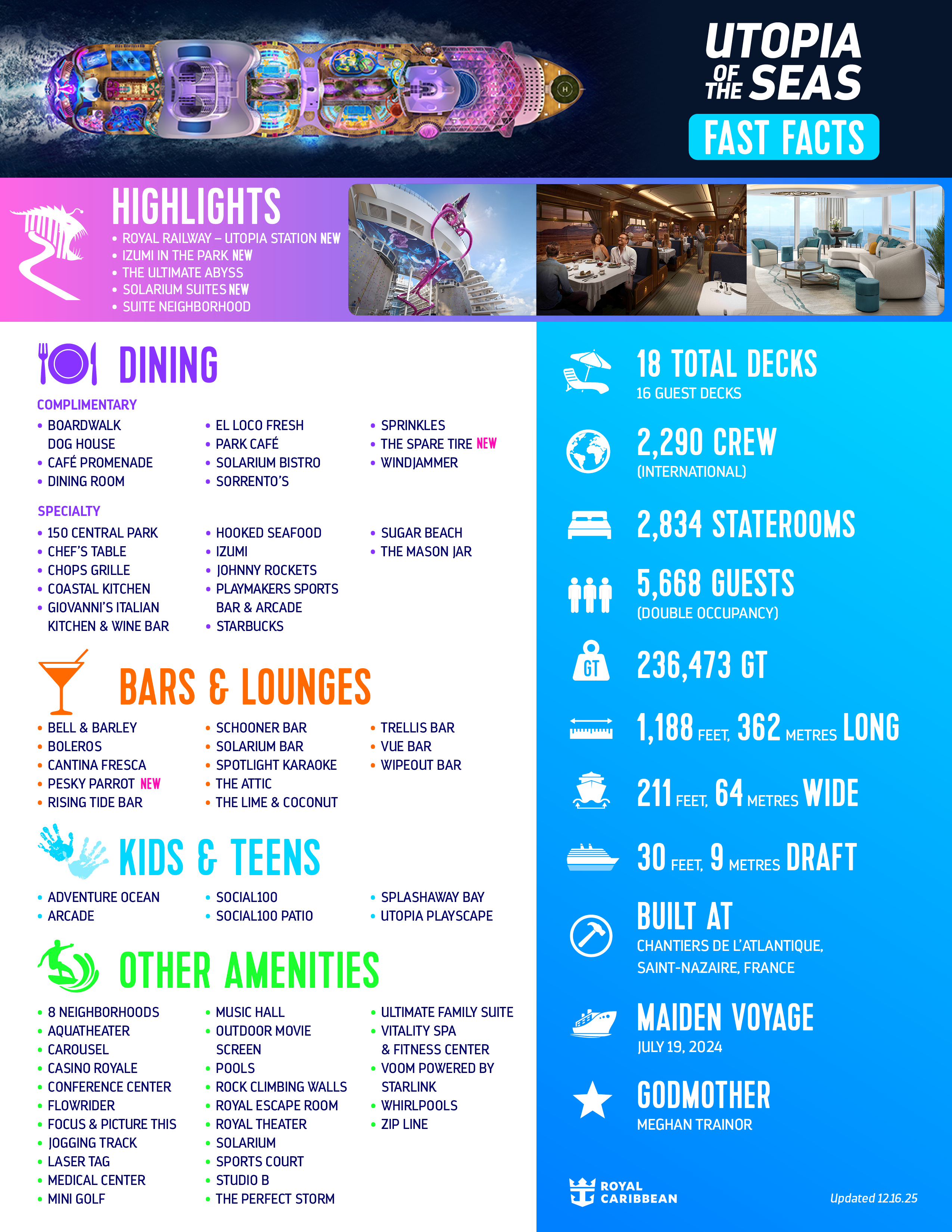Kicking off the 3-night celebration, Royal Caribbean and Trainor will officially name Utopia in the company of special guests, the ship’s crew members, media, partners and 52 fans – one for every weekend of the year – and their guests. Trainor, as godmother, will join a longstanding maritime tradition when she bestows safekeeping onto the ultimate short getaway, its crew and the millions who will vacation on Utopia for years to come. Keeping the party going will be Trainor’s exclusive show in the iconic open-air AquaTheater, and fans will also be able to slip behind the velvet ropes to meet the star in person.