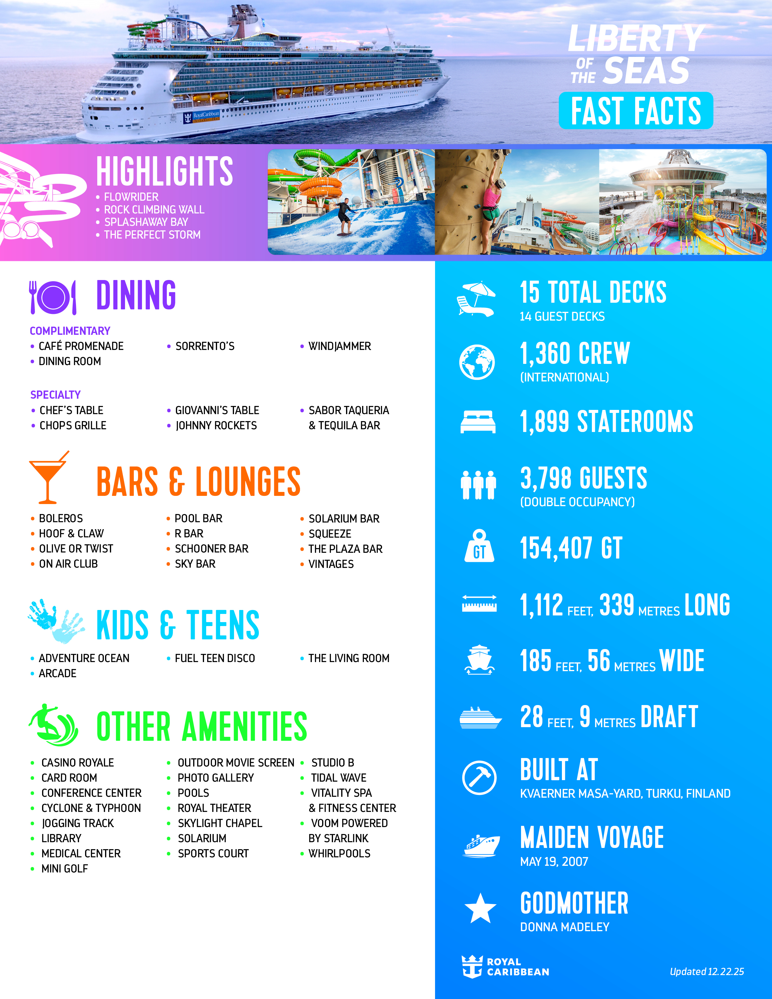 Los vacacionistas a bordo de Liberty of the Seas pueden disfrutar de audaces aventuras, desde Tidal Wave, el primer tobogán estilo boomerang en el mar, hasta los toboganes acuáticos de carreras The Perfect Storm; así como vida nocturna y restaurantes para todo tipo de huéspedes.