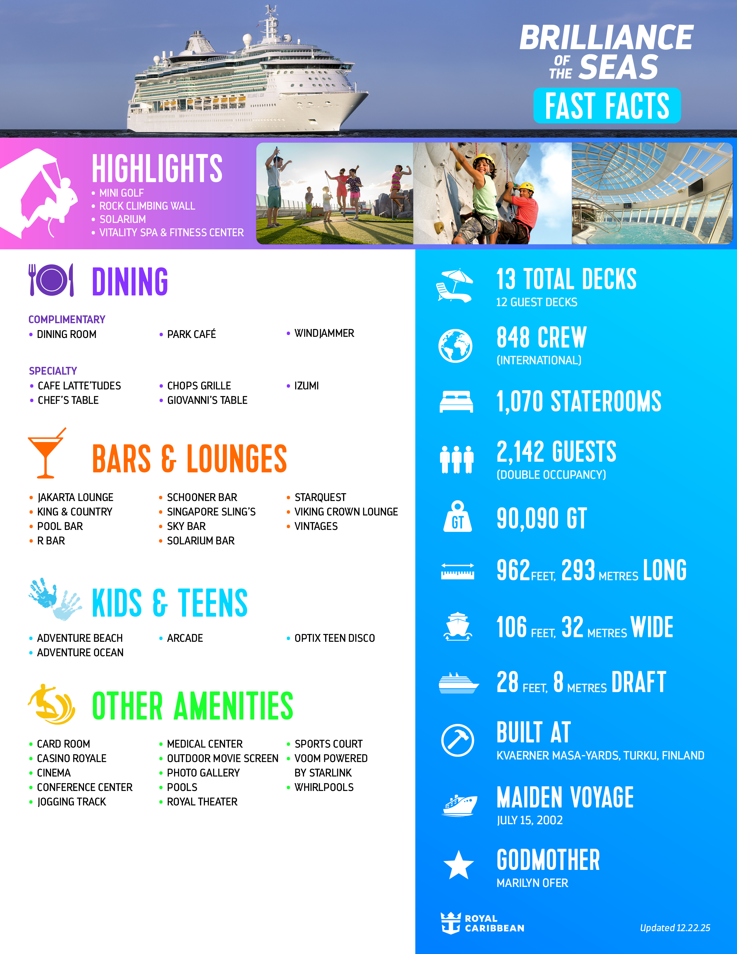 Royal Caribbean’s Brilliance of the Seas features a lineup of experiences, a world of flavors and entertainment. From family-style Italian favorites Giovanni’s Table to prime cuts at American steakhouse Chops Grille and thrills like a rock climbing wall and mini golf, vacationers of all ages can make memories.