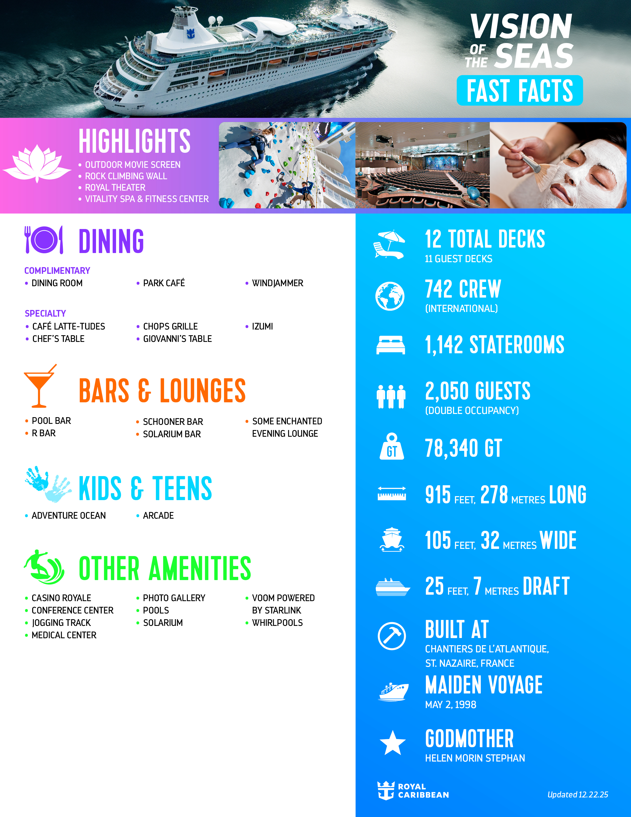 Royal Caribbean’s Vision of the Seas features a variety of restaurants, including the Asian-inspired Izumi and American steakhouse Chops Grille, original entertainment and activities for all ages, such as the deck-defying rock climbing wall and movie nights under the stars – courtesy of the outdoor movie screen.