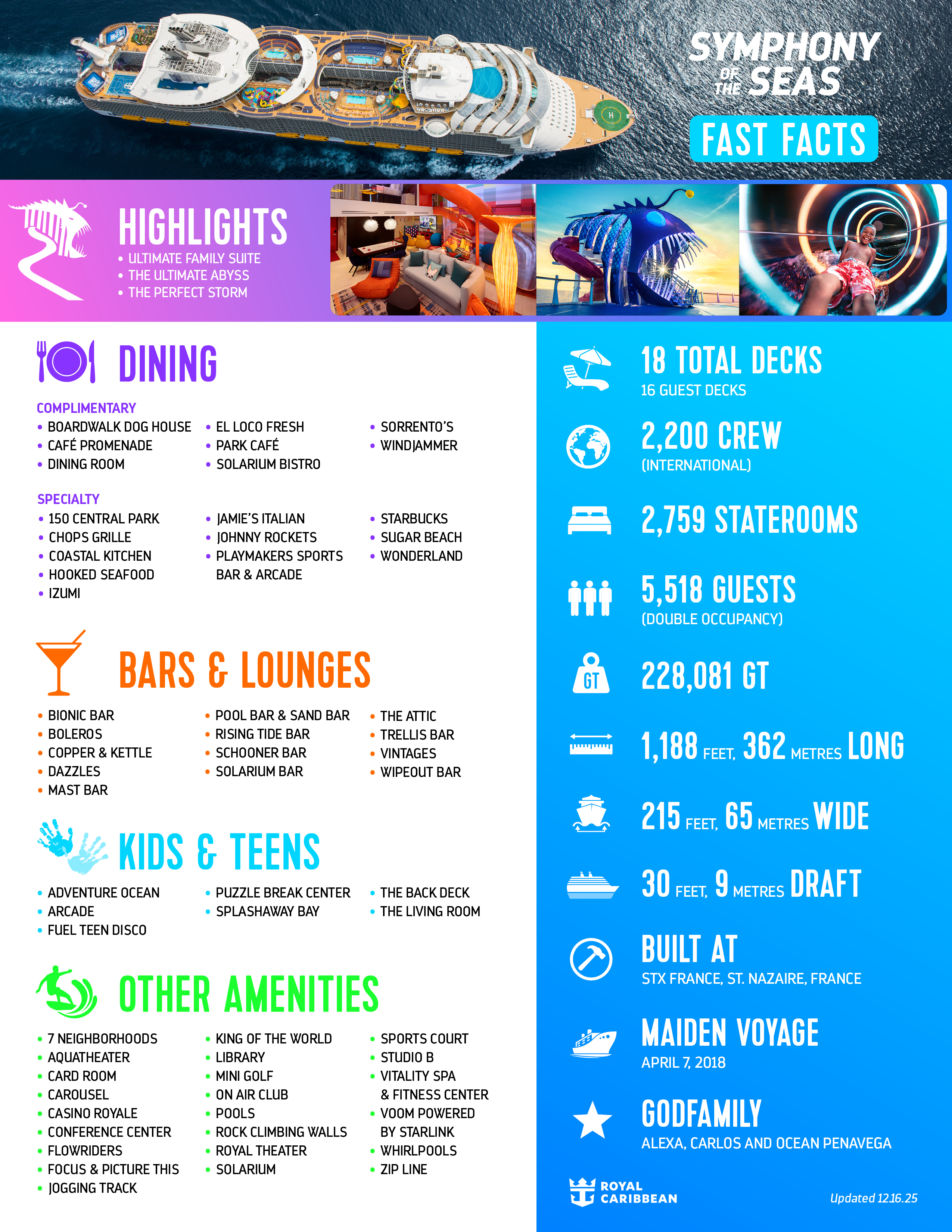 The seven distinct neighborhoods on Royal Caribbean’s Symphony of the Seas features favorites for everyone, including the 10-deck-high zip line, the Ultimate Abyss, FlowRider surf simulators, the Ultimate Family Suite, Playmakers Sports Bar & Arcade and more.