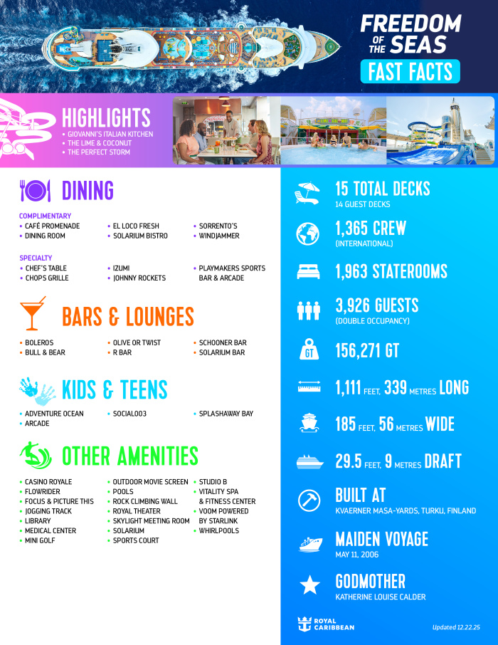Royal Caribbean's amplified Freedom of the Seas features a lineup of thrills from bow to stern, including a resort-style Caribbean pool deck, the Splashaway Bay kids aqua park, signature poolside bar The Lime & Coconut – complete with a rooftop deck – and restaurants such as Izumi and Giovanni’s Italian Kitchen.