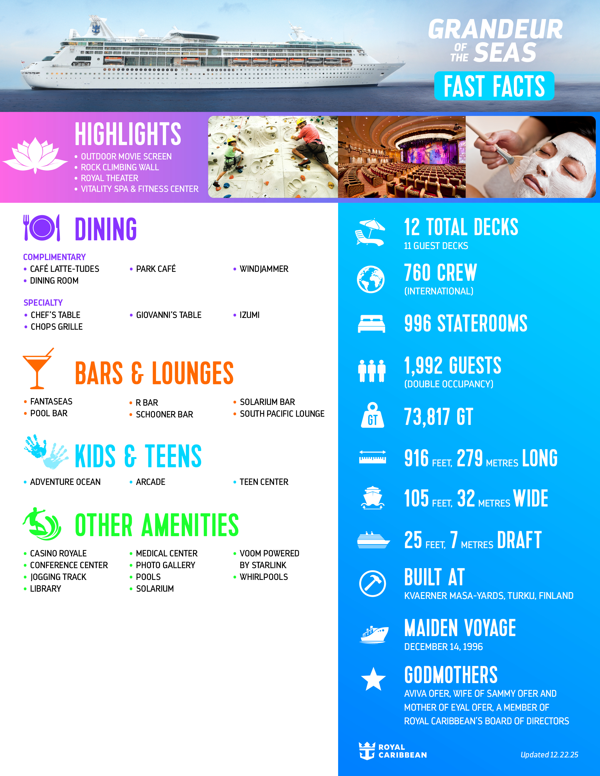 Grandeur of the Seas offers guests a variety of experiences, from rock climbing and original entertainment to a poolside movie screen and 15 bars, restaurants and lounges.