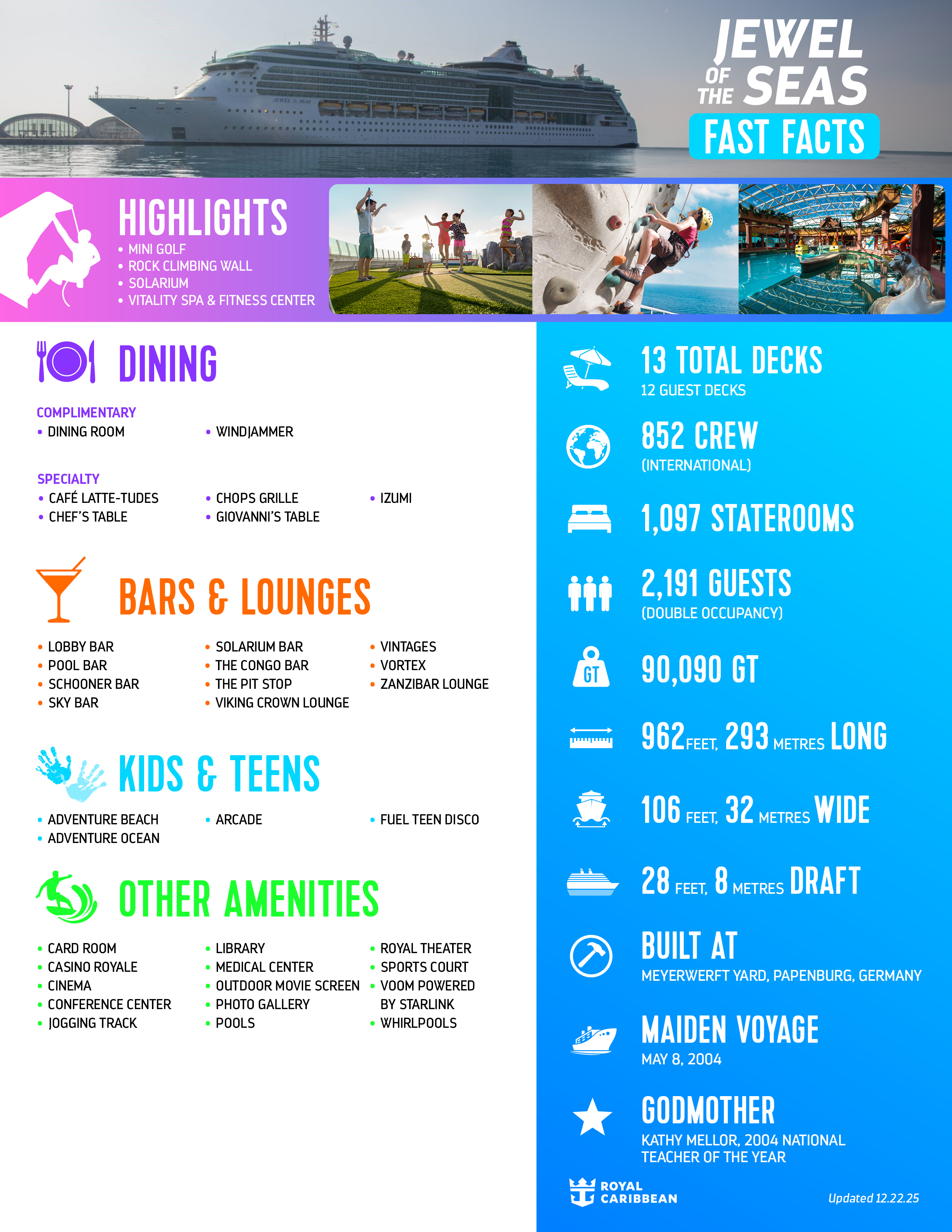 Jewel of the Seas offers sweeping ocean views with three acres of glass windows and a variety of features and experiences, from rock climbing, to specialty restaurants, to a poolside movie screen.