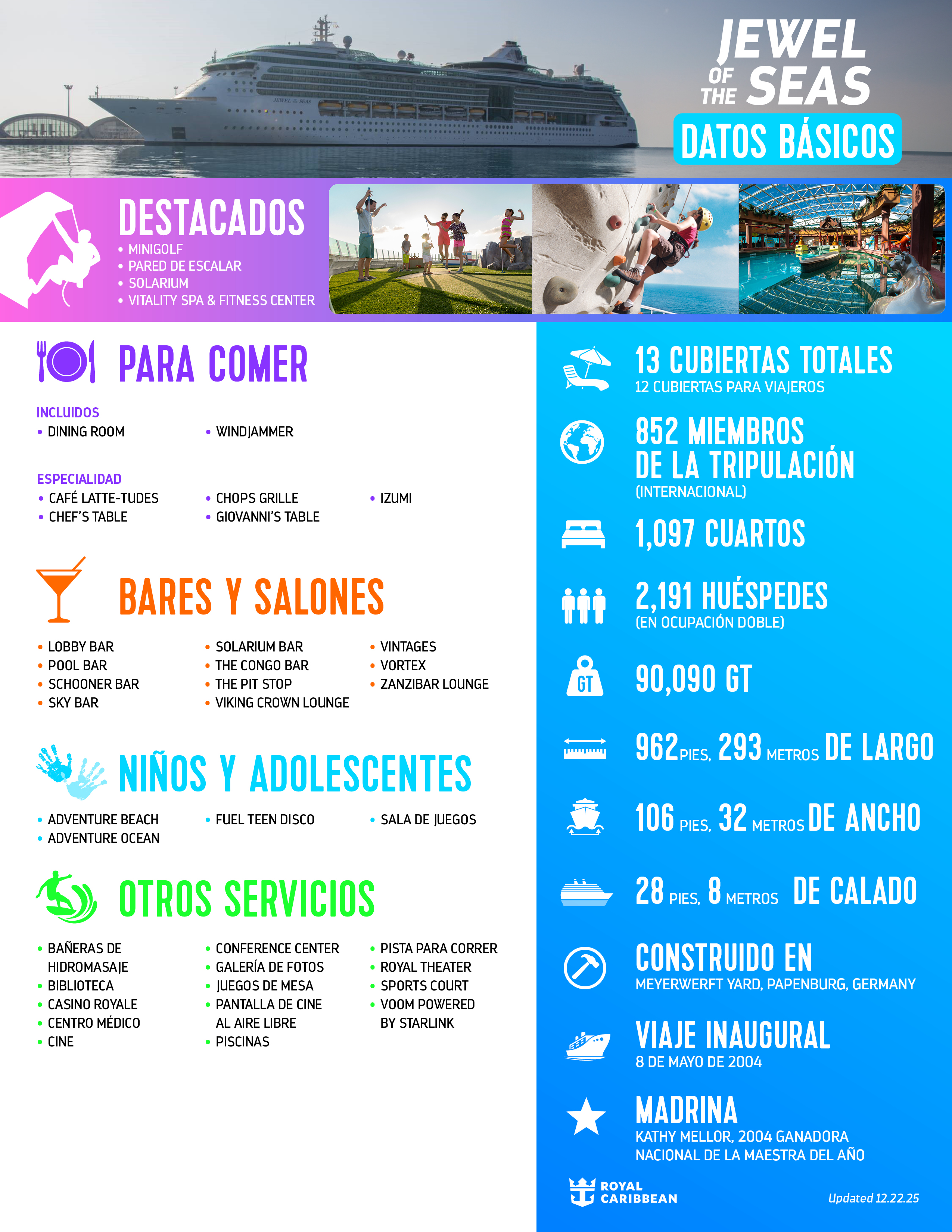 Jewel of the Seas offers sweeping ocean views with three acres of glass windows and a variety of features and experiences, from rock climbing, to specialty restaurants, to a poolside movie screen.Jewel of the Seas ofrece amplias vistas al mar con tres acres de ventanas de vidrio y una variedad de características y experiencias, desde escalada en roca hasta restaurantes de especialidades y una pantalla de cine junto a la piscina.